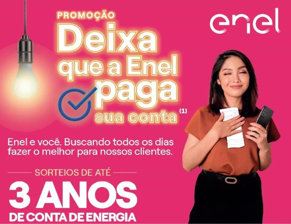 A Enel Brasil está com a ação “Deixa que a Enel paga a sua conta, que oferece aos clientes créditos na conta de energia elétrica, em prêmios instantâneos no valor de R$ 100,00, além de sorteios de até três anos de conta grátis. Todos os clientes ativos que sejam titulares de contas de energia residencial (pessoa física) emitidas pelas empresas Enel Distribuição São Paulo e Enel Distribuição Rio de Janeiro podem participar, após cadastro no hotsite.