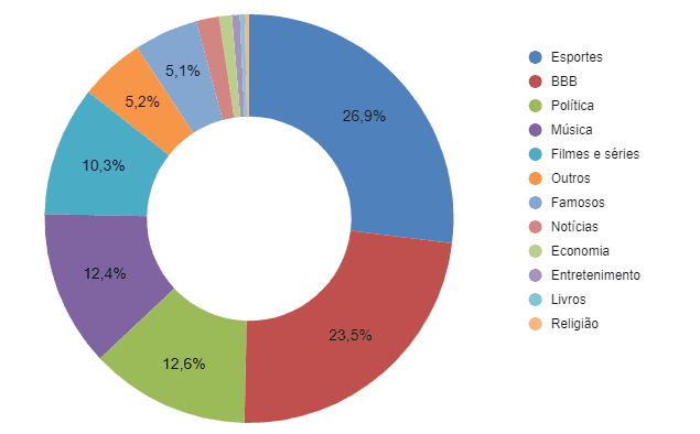 Esportes e BBB somam metade do Buzz de janeiro nos TT’s Esportes, que foi a categoria com mais assuntos em alta, se destacou com o futebol nacional e internacional. Nomes de jogadores, de times e de campeonatos apareceram nos TT’s. Além disso, também integram a categoria Esportes o campeonato de futebol americano National Football League (NFL), o principal torneio mundial de basquete – o National Basketball Association (NBA) – e o torneio de tênis Australian Open. Após isso, o reality show Big Brother Brasil estreou na TV Globo apenas na metade de janeiro, no dia 16, mas já mostrou engajamento do público nas conversas do Twitter. A hashtag #BBB23 foi o termo com mais aparições nos TT’s no período, aparecendo 1.431 vezes. Música, Política, Filmes e Séries, Famosos, Direitos Humanos e Notícias também são categorias que aparecem com certo destaque no gráfico. TOP 10 – Esportes Entre os temas mais falados estiveram Flamengo, Corinthians e jogadores do Vasco + Basquete (NBA) e Futebol Americano (NFL) O termo que apareceu mais vezes nos TT’s relacionado à esportes foi “Flamengo”, que também foi destaque nos TT’s de 2022. O treinador do Flamengo, Vitor Pereira, e o meio-campista Gerson também apareceram no TOP 10. Outros dois jogadores do Vasco se destacaram em janeiro: o Pedro Raul, que ganhou mais popularidade e confiança da torcida vascaína; e o Emerson Jake, que viralizou no Twitter após um meme com trocadilhos com o nome do jogador, como “Emerson Shake” e “Emerson Sheik”. O Corinthians também apareceu com frequência nos TT’s. Mostrando também a força e o interesse do público brasileiro por campeonatos americanos, 4 dos 10 termos da categoria esportes que mais apareceram nos TT’s foram sobre a NBA e a NFL. A hashtag do campeonato de futebol americano #NFLnaESPN ficou em 4º lugar e os termos “Lakers”, “Celtics” e “Lebron” também apareceram com destaque, relacionados à uma partida de basquete do Lakers contra o Celtics em que houve um lance polêmico de falta envolvendo o jogador Lebron James. TOP 10 – BBB A hashtag #BBB23, os participantes do reality e até Tadeu Schmidt se destacaram em janeiro. Nos termos relacionados ao BBB, que ocuparam 11 dos 12 posições gerais dos TT’s de janeiro, além da hashtag do programa, #BBB23, alguns participantes tiveram destaque: Gabriel, Marília, Domitila, Dr. Fred, Bruna, Gustavo, Larissa e Amanda. Percebe-se que, dentre esses, a maioria esteve envolvida em alguma dinâmica do programa no mês de janeiro – como líder, paredão e quarto secreto. Além deles, destaque também para o jornalista e apresentador Tadeu Schmidt, que comanda o reality pelo segundo ano e ganhou a aprovação do público no Twitter. TOP 10 – Música Na categoria Música, disparadamente quem apareceu mais vezes nos TT’s foi a cantora Shakira. O grande buzz aconteceu após o lançamento do clipe de Bzrp Music Sessions, Vol.53. A música é repleta de referências à polêmica traição que acabou com o casamento da cantora com o ex-jogador de futebol Gerard Piqué. O lançamento da Tour Soy Rebelde, do grupo mexicano RBD, também se destacou em janeiro. Além da hashtag do evento, #SoyRebeldeTour, o nome da bilheteria de ingressos Eventim, responsável pelos tickets dos shows no Brasil, também aparece com destaque. Muitos usuários relataram dificuldades de compra no Twitter. Os cantores Lana Del Rey, Anitta, Orochi, João Gomes, Taeyong, Yuta e Eric também aparecem no ranking musical de buzz dos TT’s em janeiro. TOP 10 – Política Na categoria Política, o termo que mais apareceu nos TT’s foi o nome do youtuber Monark, que teve sua conta do Twitter suspensa por uma decisão judicial após fazer posts em apoio aos atos criminosos cometidos em Brasília no dia 8 de janeiro. O jornalista político Glenn Greenwald, do The Intercept, também apareceu com destaque, fazendo a cobertura desses mesmos eventos. O presidente Lula, que teve sua posse no dia 1º de janeiro, também teve um grande buzz no Twitter. O termo Yanomami se destacou em janeiro por causa da situação de crise das aldeias indígenas Yanomamis, com centenas de mortos e doentes, que tiveram mais de 20 pedidos de ajuda ignorados pelo poder público nos últimos anos. Com a mudança de governo e a descoberta dessa crise humanitária, o tema repercutiu no Twitter e teve ainda outros termos relacionados entre os 200 mais repetidos. Top 10 - Filmes e Séries Janeiro foi marcado por vários lançamentos de séries e filmes. O termo desta categoria com mais aparições no Trending Topics foi “Boate Kiss”, tema que ganhou novamente destaque com o lançamento da série da Netflix “Todo dia a mesma noite”, baseada no livro da jornalista Daniela Arbex, que conta a história da tragédia da Boate Kiss que matou 242 pessoas em 2013 e a busca das famílias por justiça. O filme que mais teve destaque foi Teen Wolf, que apareceu no TOP 10 de TT’s da categoria com três termos: “Teen Wolf”, “Stiles” e “Derek” – os dois últimos são personagens do filme. Uma série que também garantiu três termos mais recorrentes no TT’s foi The Last of Us, da HBO. Além do próprio nome da série, a sigla TLOU e o nome da personagem Ellie tiveram destaque. Completaram o ranking os termos “Oscar”, referente às indicações da premiação; “Ginny”, personagem da série “Ginny e Georgia”, que teve a segunda temporada lançada em janeiro pela Netflix; e “Briggs”, referência ao ator e dublador Guilherme Briggs, que anunciou sua saída do anime Chainsaw Man após sofrer cyberbulling e ameaças do público. Seja no esporte, na política ou no entretenimento, acompanhar os Trending Topics do Twitter permite estar por dentro das conversas do público, entender quais assuntos são relevantes para ele e como impactá-los, ter insights estratégicos para a sua marca e acompanhar tendências em tempo real. Leia também: KOO: conhe