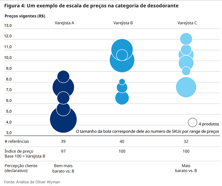 Segundo o relatório, o paradoxo entre elasticidade direta de curto prazo e imagem de preço gera um conjunto de implicações para os varejistas. Arnaud contou ainda que, para resolver isso é necessário investir na base da pirâmide. Os varejistas mais competitivos conseguem financiar esse esforço com uma otimização econômica das alavancas da parte superior da pirâmide. “Um jogo sutil que exige uma compreensão profunda da contribuição econômica de cada alavanca”, diz. Sortimento na estratégia de preços O estudo também destaca que o varejista ao cuidar bem dos produtos de primeiro preço, e cujo sortimento se inclina fortemente para produtos com valores perto da média da categoria, tende a se beneficiar de uma melhor percepção de preço em comparação a um varejista que decide se concentrar em produtos acima do valor médio da categoria. Segundo Arnaud, isso ocorre mesmo quando esses produtos possuem preços competitivos, conforme simulação feita pela consultoria comparando preços na categoria de desodorante. “Nessa estratégia, a marca própria desempenha um papel fundamental, trazendo geralmente uma alternativa de ótimo custo-benefício comparado com produtos de marca nacional. Também existem categorias com maior impacto na imagem de preços. Isso porque o exercício de sortimento carrega o potencial de trazer ainda mais retorno”, explica o especialista. “No entanto, melhorar a percepção abordando essa alavanca não elimina os riscos de curto prazo. Por exemplo, expandir o sortimento de produtos de baixo custo pode fornecer aos consumidores caminhos de trade-down e diluir a margem, mas pode ser poderoso a longo prazo para direcionar a percepção (e o tráfego)”, complementa.