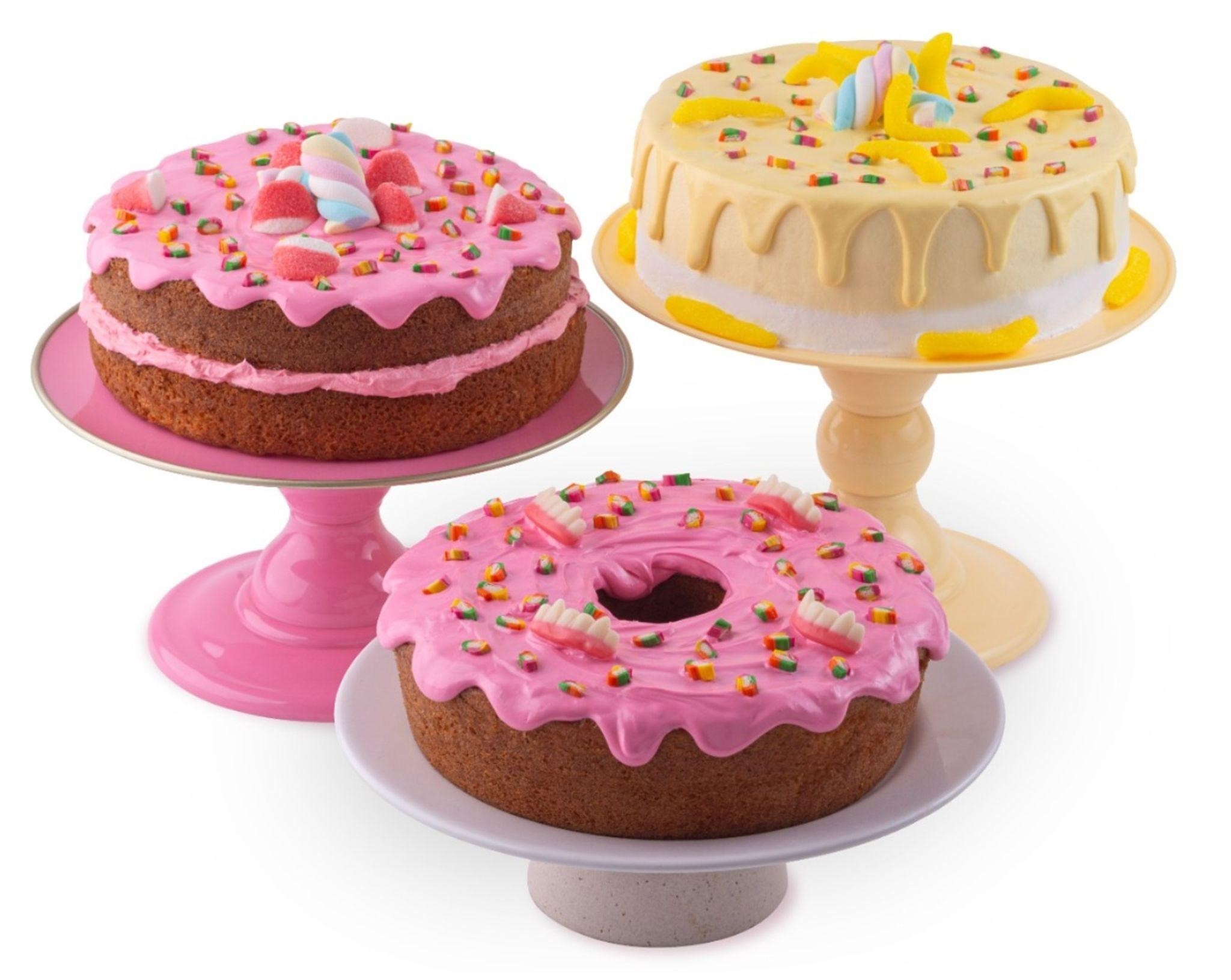 Bolo Premium com Fini Banana: Massa de leite com recheio de creme e gelatina Fini Banana, coberto com chantilly e decorado com gelatinas Tubbes e pedaços de marshmallow.
