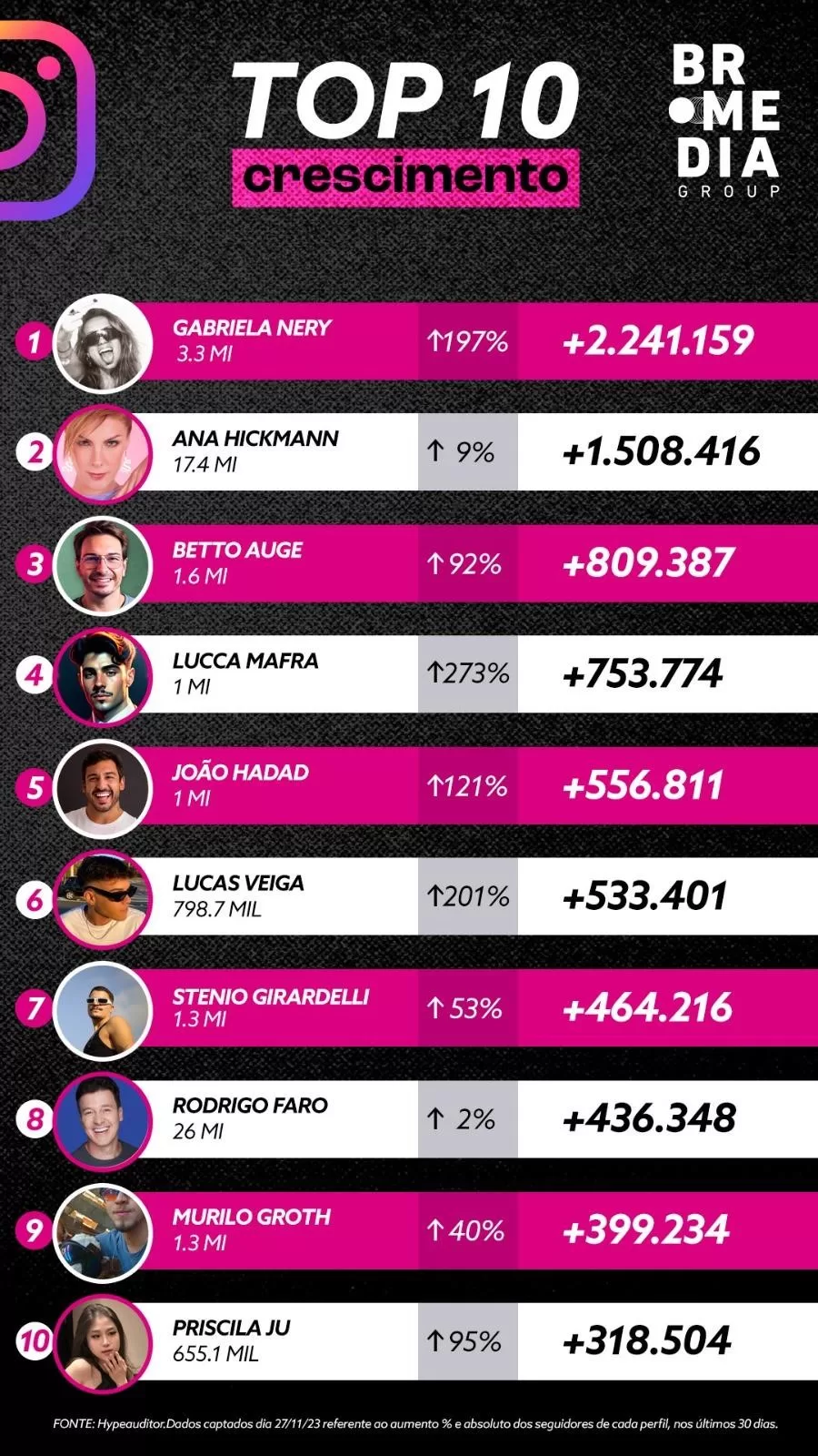 Já na segunda posição está Ana Hickmann, empresária, ex-modelo e atualmente apresentadora do programa Hoje em Dia, na Record, que conquistou mais de um milhão de seguidores após denunciar a agressão que sofreu do seu ex-marido, Alexandre Correa. Ana seguiu em alta após dar uma entrevista exclusiva contando detalhes sobre o caso de agressão e questões do relacionamento conturbado.