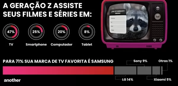Neste ponto da pesquisa, as desmistificações propostas pela Another começam a ficar mais claras. O estudo aponta que a crença de que a Geração Z não consome mídia tradicional, como a televisão, é completamente falsa: 47% dos Zoomers assistem a seus filmes ou séries favoritos em TVs, 25% em smartphones, 20% em computadores e 8% em tablets.
