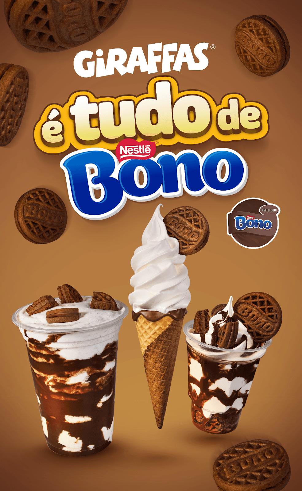O Giraffas firmou uma parceria inédita com a Bono, tradicional marca de biscoitos recheados, para lançar a linha “Tudo de Bono”. A novidade traz três sobremesas exclusivas – Casquinha Recheada, Sundae e Milk-shake – que combinam sabores e texturas características de ambas as marcas.