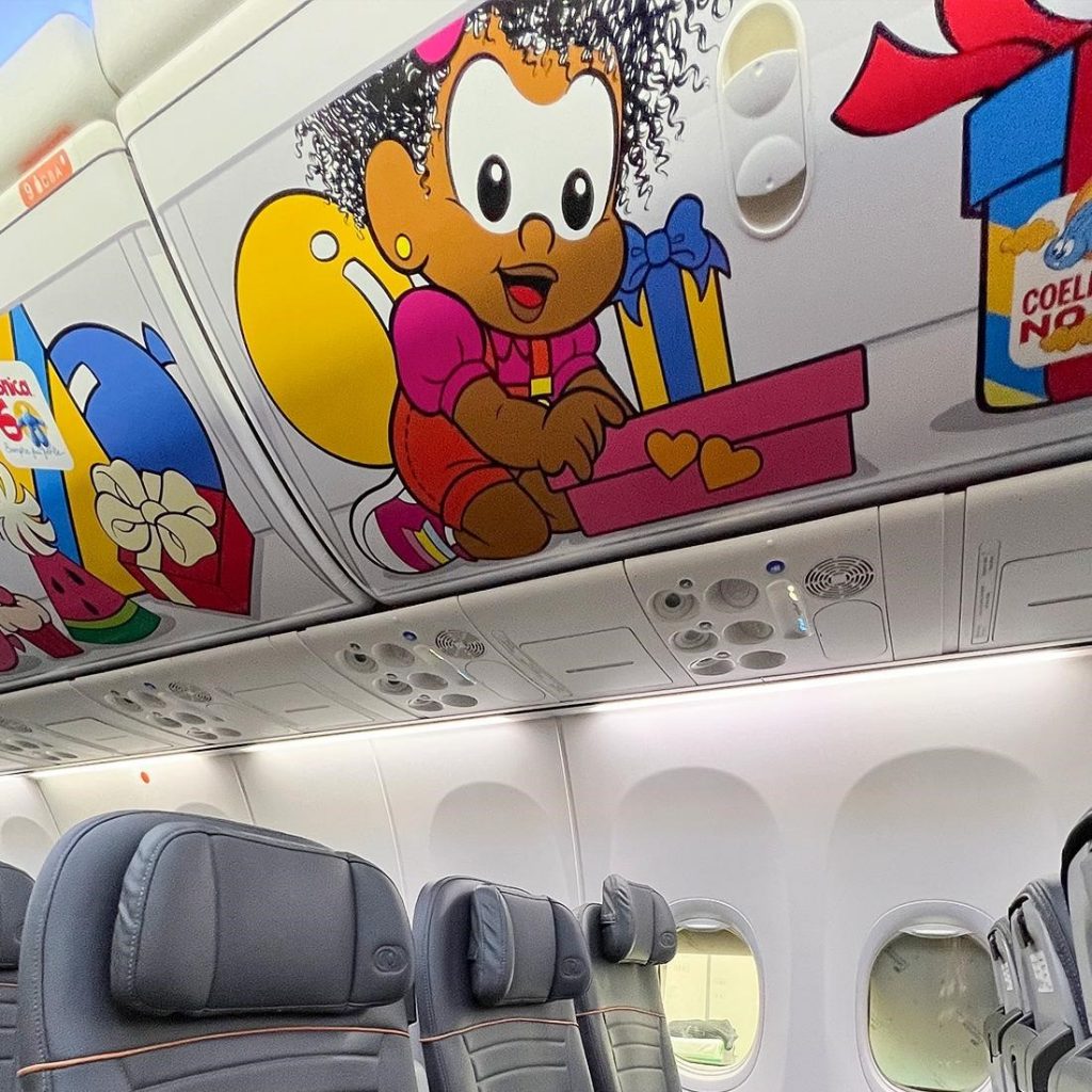 Já na parte interna, os bancos da aeronave foram decorados com encostos de cabeça temáticos. As mesas de bordo ganharam tirinhas exclusivas e os compartimentos de bagagem exibem adesivos festivos, com presentes e personagens relacionados à Mônica, que transformam a cabine em uma festa surpresa.