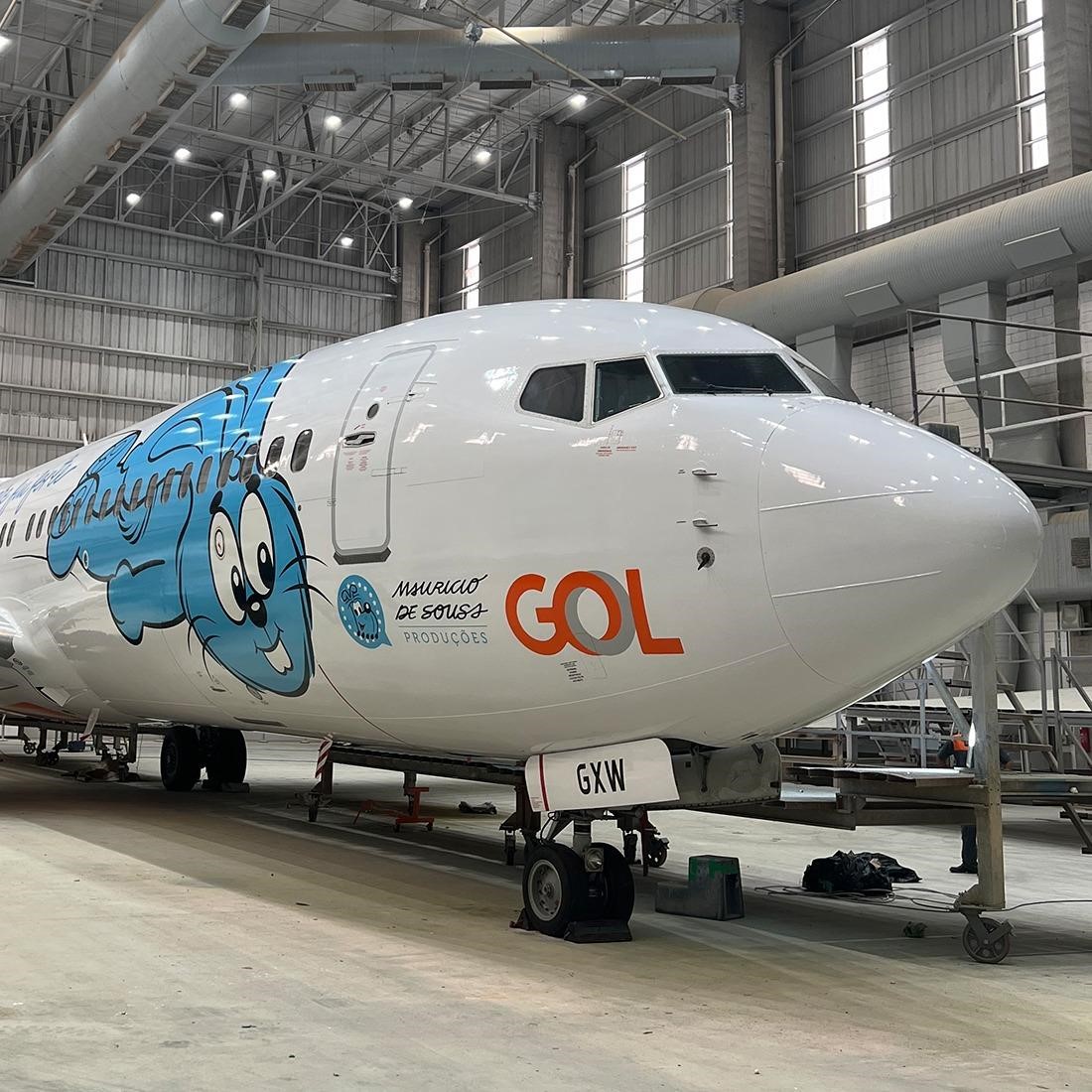 A companhia aérea decorou um Boeing 737-800 com adesivos e artes inéditas, criados pela MSP, que estampam detalhes tanto na fuselagem quanto o interior da aeronave. A parte traseira externa ilustra Mônica lançando Sansão, seu famoso coelho azul, que é projetado em direção à cabine dos pilotos.