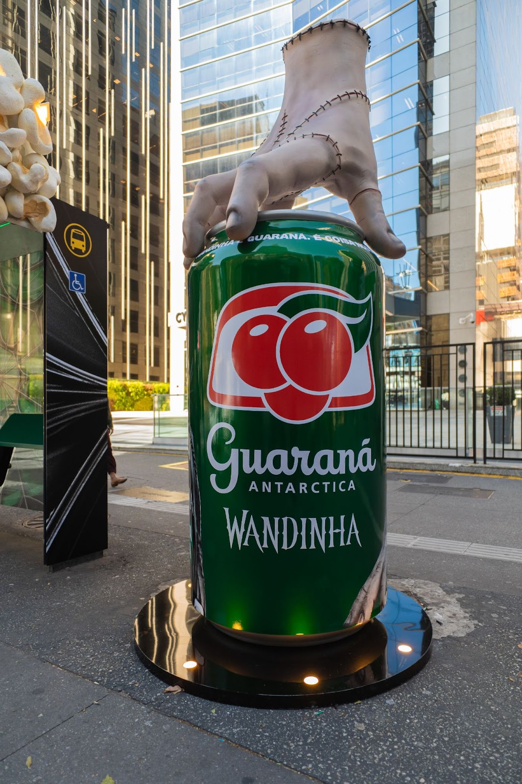 O abrigo exibe uma lata gigante do refrigerante ao lado do “Mãozinha”, personagem popular da produção, criando uma ambientação interativa pensada para fotos e compartilhamentos dos fãs.