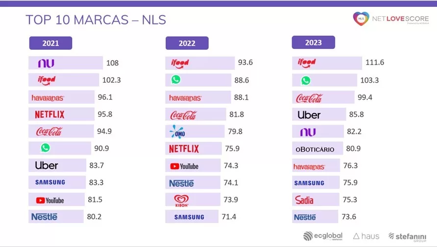 A comparação entre os três últimos anos de pesquisa aponta a intermitência da presença de marcas como Nubank, Netflix, Uber e YouTube nas diferentes edições do ranking, enquanto marcas como iFood, Coca-Cola, Samsung e WhatsApp mantiveram a consistência durante os três anos avaliados e garantiram presença perene.