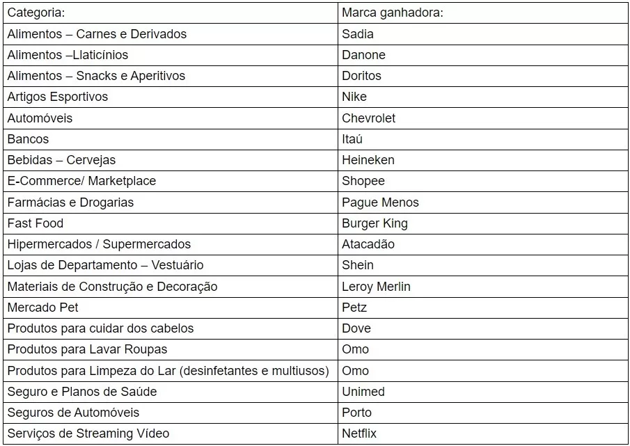Outras marcas, como Nike, Chevrolet, Burger King e Itaú também foram as campeãs em seus respectivos segmentos, mas não aparecem no Top 10. Confira as principais marcas vencedoras de sua categoria: