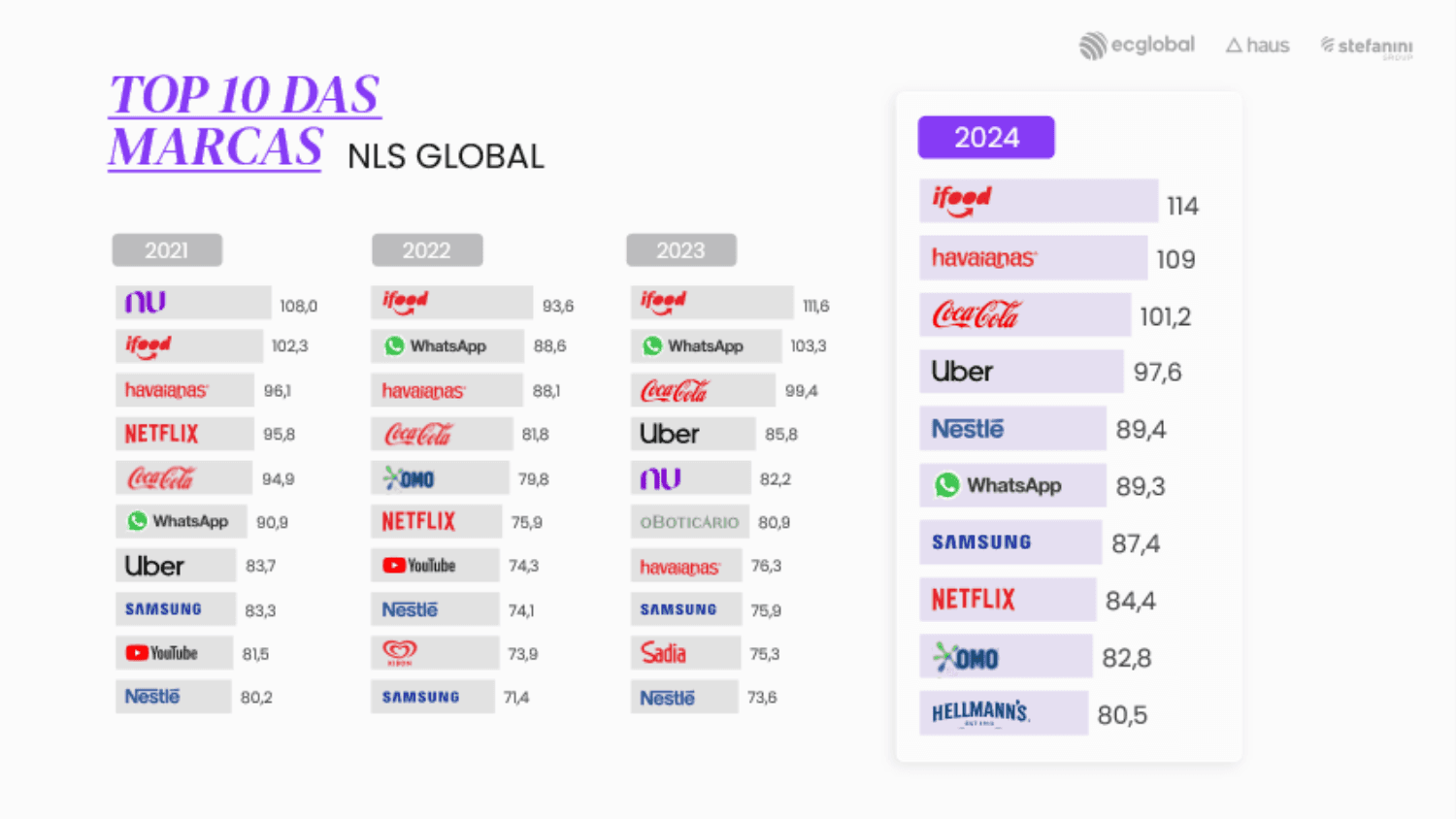 Em seguida, aparecem no ranking de love brands as seguintes marcas: Havaianas (110 pontos no NLS), Coca-Cola (101,2), Uber (97,6), Nestlé (89,4), WhatsApp (89,3), Samsung (87,4), Netflix (84,4), Omo (82,8) e Hellmann’s (80,5). Cabe destacar que a presença da Nestlé na quinta posição está associada ao desempenho da marca no setor de laticínios. A empresa também aparece na 11ª posição por sua performance no mercado de chocolates.