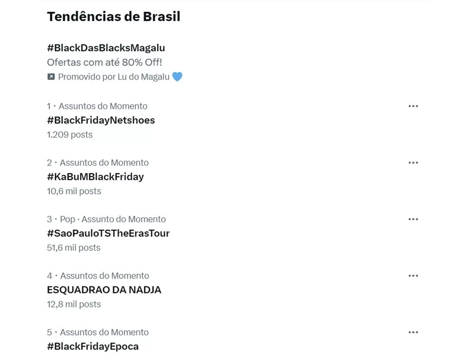 As hashtags #BlackFridayNetshoes e #KaBuMBlackFriday figuraram em primeiro e em segundo lugares, ficando, inclusive, acima da #SaoPauloTSTheErasTour, que marca o show da cantora Taylor Swift em São Paulo nesta mesma data. A #BlackFridayEpoca também esteve no Top 5 da rede social, enquanto a #BlackDasBlacksMagalu alcançou mais de 26 mil menções até o fechamento desta matéria.