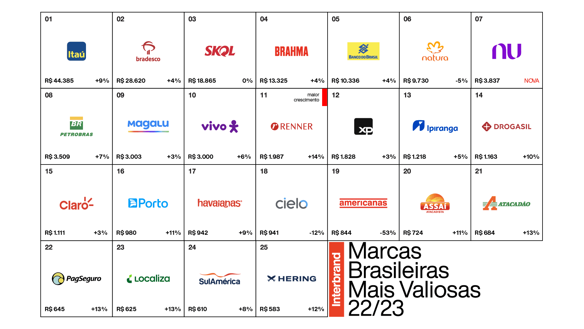 A marca é um dos ativos mais importantes de uma empresa. Não é à toa que muitas estratégias são focadas na reputação e a percepção que o mercado tem delas. De acordo com a Interbrand, consultoria global de marcas, Itaú, Bradesco, Skol e Brahma são as marcas mais valiosas do Brasil, obedecendo critérios como alinhamento, empatia e presença. As quatro primeiras posições do ranking do estudo Marcas Brasileiras Mais Valiosas 22/23 repetem o apontamento do ano anterior, reforçando a potência histórica de bancos e cervejas. No topo da lista está o Itaú, com valor de marca estimado em R$ 44,3 bilhões, seguido respectivamente por Bradesco, com R$ 28,6 bilhões; Skol, com R$ 18,8 bilhões; Brahma, com R$ 13,3 bilhões e, por fim, Banco do Brasil, com R$ 10,3 bilhões. Somadas, as 25 marcas que compõem o ranking ultrapassaram o valor de R$ 153 bilhões, representando um crescimento de 6% na comparação com a edição anterior. Entre os destaques da atual versão do estudo está o Nubank, que estreou na tabela logo após a sua abertura de capital, já ocupando a 7ª posição, com valor de marca estimado em R$ 3,8 bilhões. Desde o início de suas operações no Brasil, a empresa abraçou a missão de lutar contra a complexidade do segmento para empoderar as pessoas, gerando admiração, confiança e afinidade com o seu público. Fatores de crescimento Em comum, as marcas com maior crescimento na atual edição do estudo apontam três fatores principais como catalisadores do resultado positivo: alinhamento, empatia e presença. De acordo com Beto Almeida, CEO da Interbrand, alinhamento é o quanto a organização está comprometida com a mesma estratégia. Empatia é o quanto a empresa responde de forma ativa e eficaz aos desejos e necessidades do consumidor e, por fim, a presença se relaciona ao quanto a marca é considerada e relembrada no momento de decisão de compra. O executivo aponta ainda que as marcas de maior crescimento do estudo foram “as que souberam se adaptar às rápidas alterações comportamentais de seu público nesta era onde a rapidez e certeza da mudança dão forma ao novo normal”. Por fim, vale ressaltar que as cinco primeiras marcas do ranking representam 75% do valor total da tabela, enfatizando o longo caminho que essas empresas percorreram ao tentar garantir a presença constante na mente dos clientes. As categorias mais representativas da lista são: serviços financeiros (59%), bebidas alcoólicas (22%) e varejo (12%). Sobe e desce Na comparação com o ranking anterior, a marca que apresenta o maior crescimento é a Renner (14%). Embora tenha subido apenas uma posição, de 12ª para 11ª, seu valor de marca saiu de R$ 1,7 bilhões para R$ 1,9 bilhões. Além do crescimento em seu lucro líquido, superando os níveis pré pandemia, o estudo mostra que a Renner se solidificou como referência em seu segmento, admirada, e cada vez mais conectada com pautas emergentes, inovações e o compromisso com a sustentabilidade. Além da varejista de moda, apenas outras sete marcas apresentaram crescimento de dois dígitos: Localiza (13%), PagSeguro (13%), Atacadão (13%), Hering (12%), Assaí (11%), Porto Seguro (11%) e Drogasil (10%). Apesar disso, o varejo, setor que mais cresceu nos últimos anos, foi impactado nessa edição pela queda significativa do valor de marca da Lojas Americanas, que saiu da 10ª para a 19ª posição. Os últimos fatos relacionados aos resultados da companhia no início de 2023, incluindo as inconsistências contábeis e o processo de recuperação judicial, foram determinantes para a avaliação no ranking. Embora as informações financeiras utilizadas no estudo sejam referentes aos anos de 2021 e 2022, a força de marca da Lojas Americanas sofreu um grande impacto, que resultou em uma desvalorização de 53%, tendo hoje como valor estimado R$ 844 milhões.