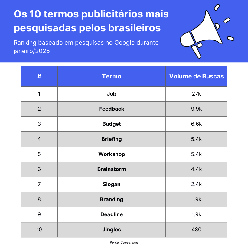 O termo “Job” é o mais popular e foi o mais buscado no Google ao longo de janeiro, com 27 mil consultadas mapeadas pela agência Conversion. Na publicidade, expressão é utilizada para se referir a trabalhos específicos dentro de uma campanha; fora dela, o termo foi adaptado para descrever relações informais de trabalho.