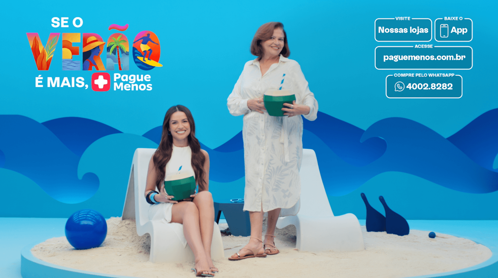 A Pague Menos lançou sua campanha nacional de verão intitulada “Se o verão é mais, Pague Menos”. A iniciativa marca o retorno da rede à mídia no período de alta temporada e tem como foco reforçar a atuação da marca junto ao consumidor em um contexto de maior demanda por cuidados com saúde, bem-estar e controle de gastos. A comunicação é estrelada pela embaixadora da marca, Juliette, acompanhada de sua mãe, Dona Fátima.