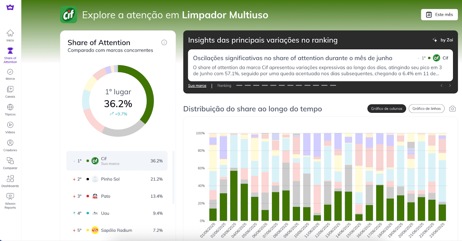 – Cif: tradicionalmente voltada a um público mais conservador, a marca identificou, via Winnin, uma afinidade inesperada com comunidades de sneakerheads (colecionadores de tênis), que descobriram a eficácia do produto para limpar calçados brancos. A partir desse insight, a marca passou a dialogar com esse público, patrocinou o Rock in Rio com o slogan “o patrocinador oficial do seu tênis limpo” e registrou um salto expressivo em vendas e brand power.