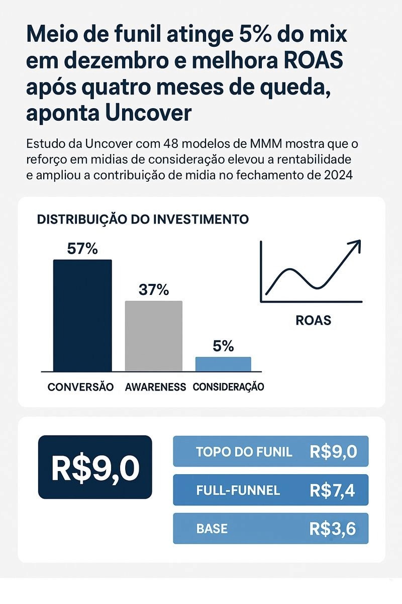 Dezembro de 2024 teve o maior share do ano para investimentos em meio de funil, que alcançaram 5% do mix, segundo o playbook Tendências mensais dos anunciantes, baseado em 48 modelos de MMM, da Uncover.