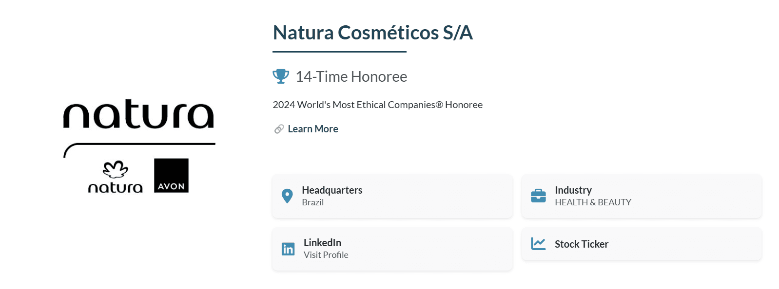 Segundo João Paulo Ferreira, CEO da Natura, a inclusão da marca no ranking pela 14ª vez comprova a consistência da atuação da empresa ao longo de seus 55 anos de história e reforça o desafio de contribuir ainda mais para uma sociedade mais próspera, justa e inclusiva. A Natura faz parte do ranking da Ethisphere desde 2011.
