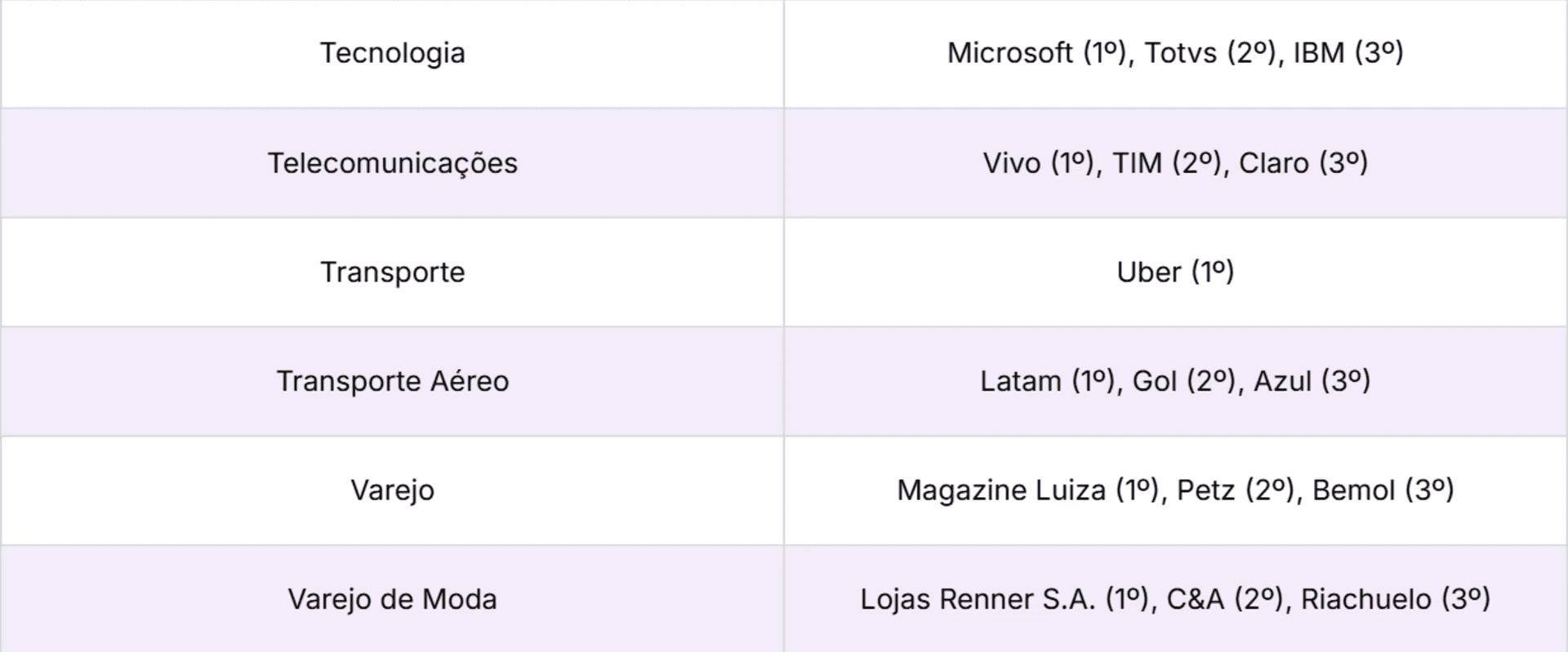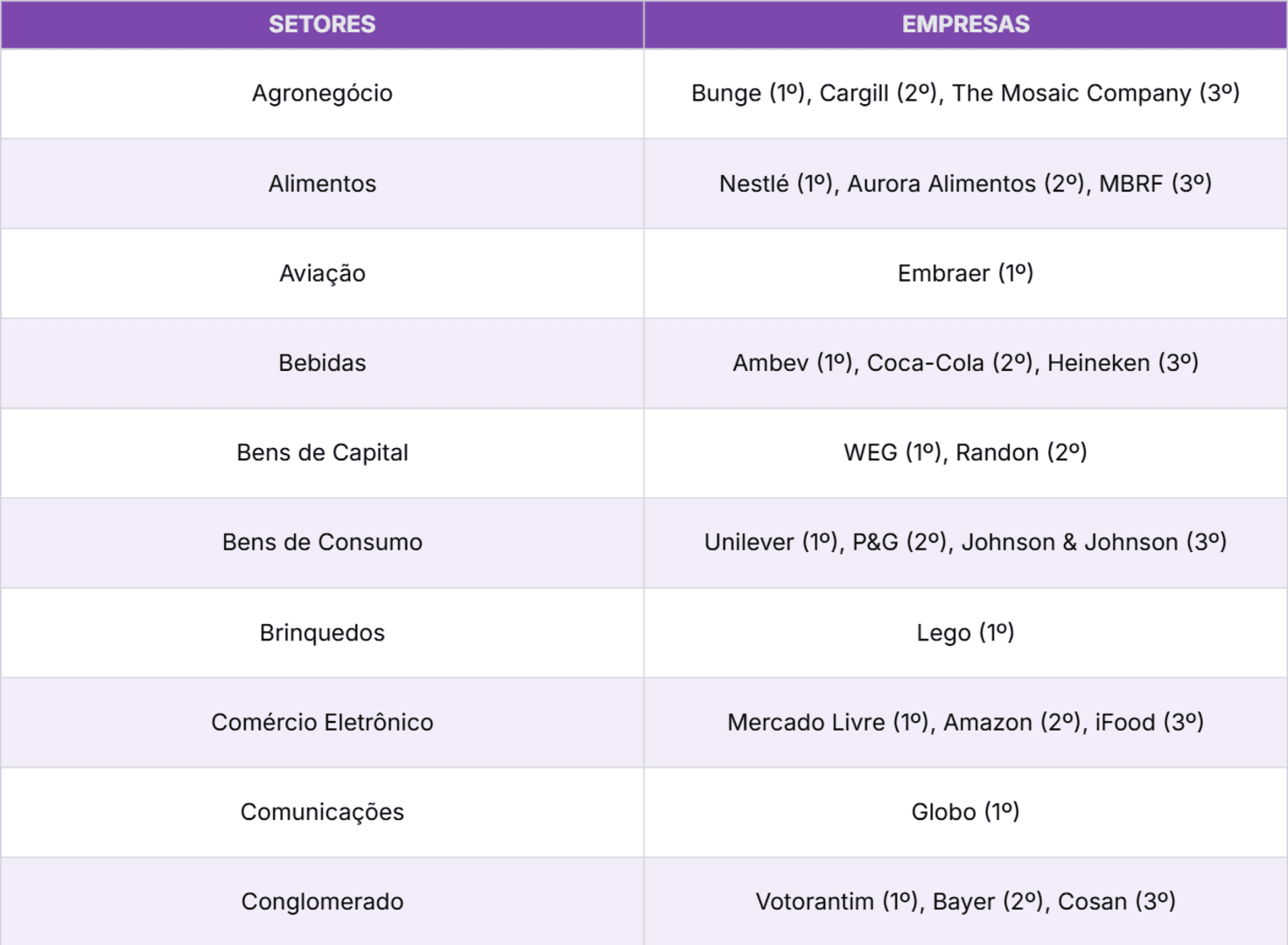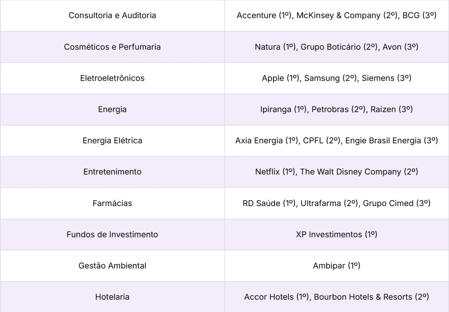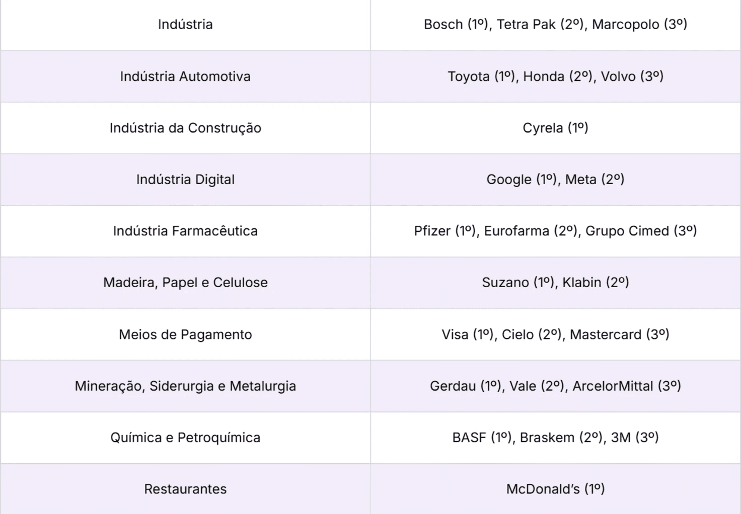 O Top 10 reúne organizações de oito setores distintos, com destaque para Bebidas e Cosméticos e Perfumaria. Completam as dez primeiras posições Grupo Boticário (4º), Itaú Unibanco (5º), Nestlé (6º), Coca-Cola (7º), Magazine Luiza (8º), Toyota (9º) e Vivo (10º).