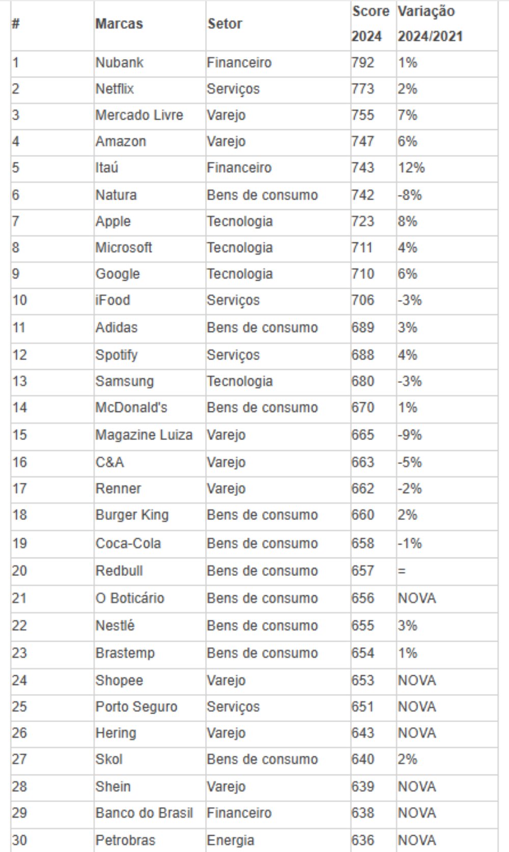 Quanto aos setores mapeados, o segmento de bens de consumo domina o ranking com dez marcas, seguido pelo varejo, com oito, e serviços, com quatro. Empresas como Natura e O Boticário se destacam pelo compromisso com a sustentabilidade e a inovação, enquanto gigantes da tecnologia como Apple, Microsoft e Google continuam moldando o futuro com avanços em inteligência artificial e realidade aumentada.