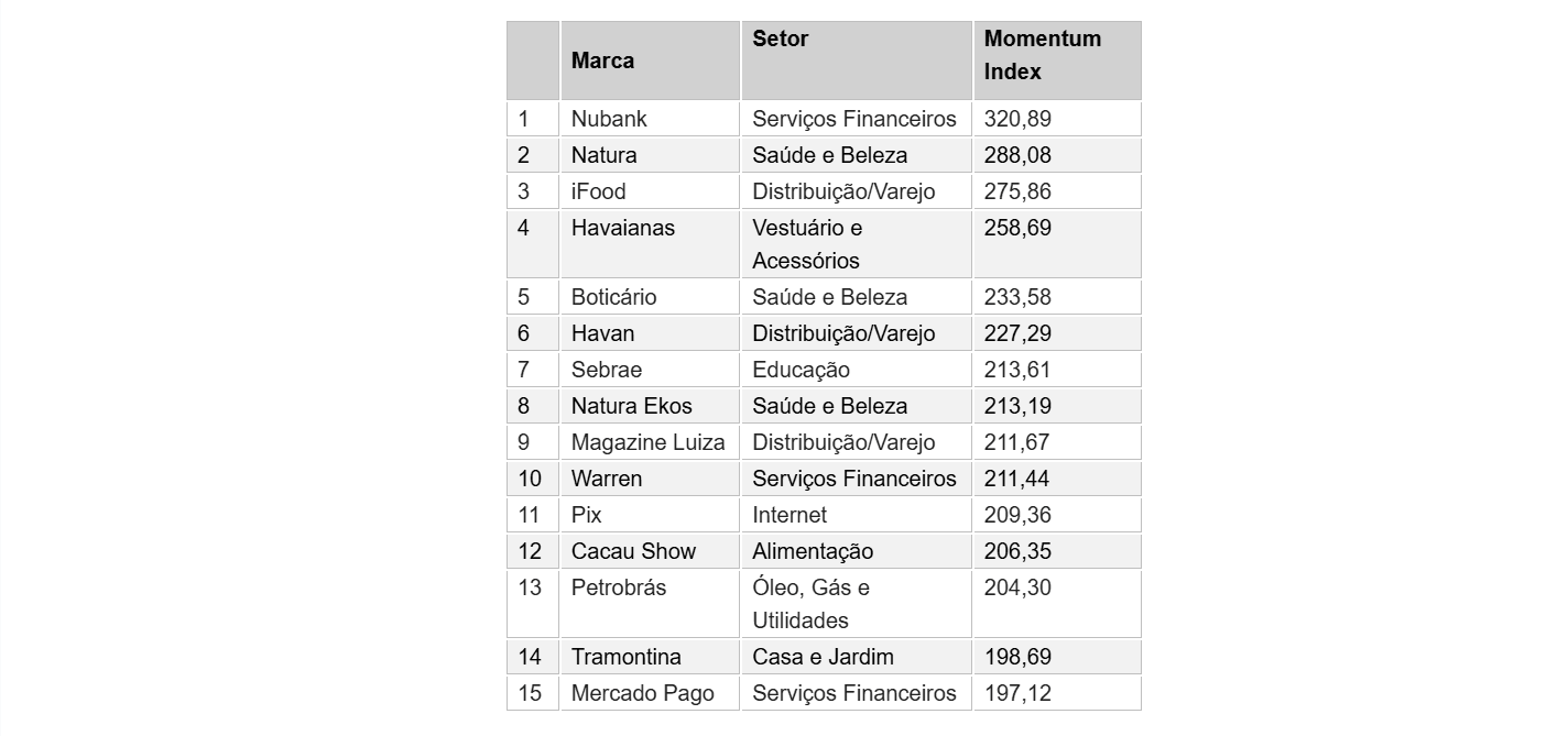 Nubank, Natura e iFood são as marcas com maior influência sobre a vida das pessoas, da cultura e de seus respectivos segmentos no Brasil, conforme dados divulgados no ranking Brand Momentum Index 2025.