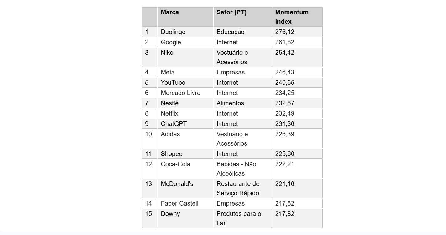No recorte global, destacam-se Duolingo, Google e Nike, Meta, YouTube, Mercado Livre, Nestlé, Netflix, ChatGPT, Adidas, Shopee, Coca-Cola, McDonald’s, Faber-Castell e Downy. O levantamento tem como base o Brand Asset Valuator (BAV), o maior banco de dados global sobre valor e imagem de marca.