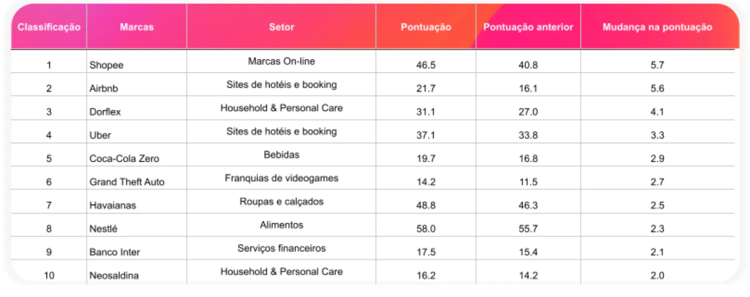 A Shopee teve a maior variação positiva entre as pontuações obtidas em 2024 e 2025. A pontuação do e-commerce subiu de 40.8 pontos para 46.5, aumento de 5.7 pontos. Na segunda colocação, a Airbnb saiu de 16.1 para 21.7 (+5.6). Dorflex fecha o Top 3, com uma escalada de 27.0 para 31.1 (+4.1).