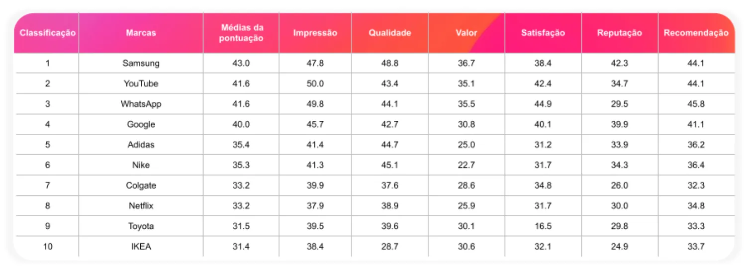 Completam o Top 10, em termos de médias gerais, as seguintes marcas: Google (40.0), Adidas (35.4), Nike (35.3), Colgate (33.2), Netflix (33.2), Toyota (31.5) e IKEA (31.4).