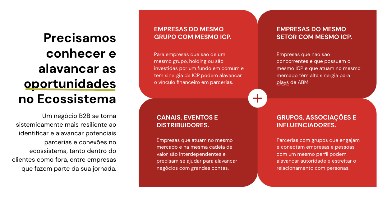 Por que é importante: Muitas estratégias de ABM falham porque focam apenas no decisor final, ignorando outros stakeholders que podem barrar ou impulsionar a decisão. Um bom mapa de ecossistema permite um olhar mais sistêmico das jornadas, trazendo novas rotas de possibilidades para deixar a organização mais integrada ao seu entorno e, portanto, mais resiliente.