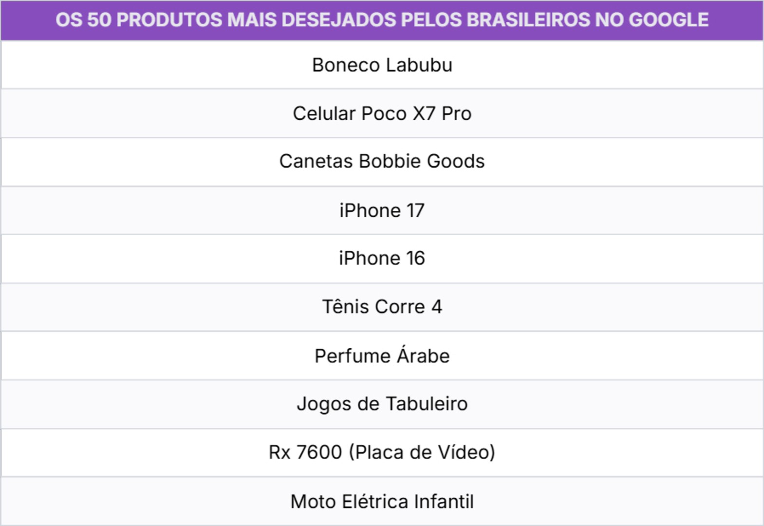 Neste contexto, a lista do Google reúne 50 itens que se destacaram em buscas e interesse, em um momento de maior confiança do consumidor e de antecipação das compras sazonais. Brinquedos, tecnologia e itens de mobilidade destacam-se na seleção.