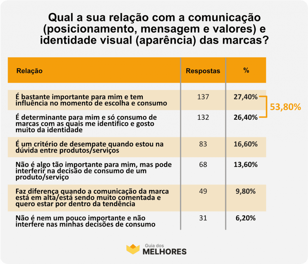 Posicionamento, mensagem, valores e identidade visual: para 54% dos consumidores, o conjunto de elementos identitários de uma marca é um fator significativo, aponta um estudo realizado pela plataforma Guia dos Melhores.
