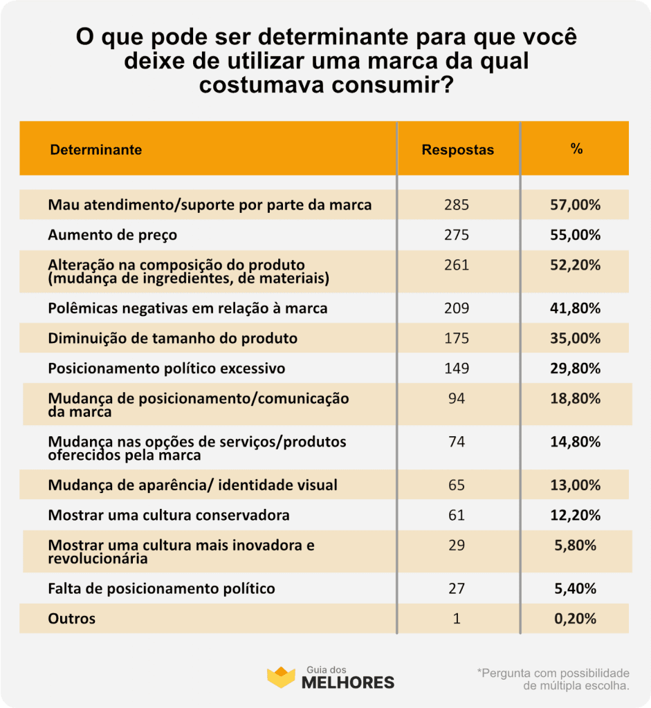 O estudo aponta que o ponto mais determinante para que se deixe de utilizar uma marca da qual se costumava consumir é o mau atendimento ou suporte por parte da empresa, gatilho de abandono determinante para 57% dos entrevistados. Para 55%, o principal motivo para o rompimento é o aumento de preço dos produtos ou serviços. Finalmente, alterações na composição do produto, como mudanças de ingredientes ou de materiais, citadas por 52%, fecham o Top 3.