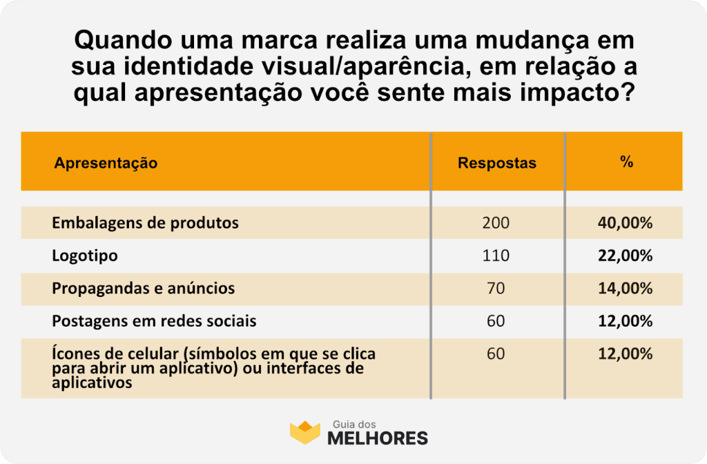 Para 40% dos consumidores ouvidos pela plataforma, as alterações em apresentações de embalagens de produtos são mais impactantes e perceptíveis. Para 22%, o posto de mudanças mais chocantes é ocupado por modificações no logotipo. Já as variações em propagandas e anúncios foram apontadas por 14% dos entrevistados, enquanto as alterações em ícones de celular foram as escolhidas por 12% dos respondentes.