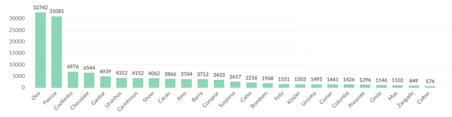 Além dos tradicionais ovos de Páscoa, outros itens comentados para a temporada de Páscoa são: Coelhinho: 6% das menções Barra: 3,5% das menções Caixa: 2,4% das menções Bombom: 2,2% das menções Cesta: 1,4% das menções Colomba: 1,3% das menções Vale lembrar que no caso do termo “coelhinho” ele está presente tanto em menções de produto quanto em posts sobre o personagem: o coelhinho da Páscoa. Nos termos de destaque ainda temos a referência aos ovos de colher, através do termo “colher”, mencionado em 1,23% dos posts. Além dos destaques já mencionados, houve grande procura por ovos com brindes, outros produtos licenciados, como o da personagem Naruto, da D’elicce, do Scooby-Doo, também da Cacau Show e preocupação com preço. Público e principais escolhas O público que fala sobre a Páscoa é em sua maioria feminino (56,3%) e no ranking de cidades dos internautas estão no topo Belo Horizonte, Brasília e Recife. A escolha de itens de Páscoa remete muito à relação afetiva, de presentear pessoas do seu círculo familiar com guloseimas ou receber um mimo. Dos usuários que falam sobre a data, 1,4% citam o termo mãe (relatando principalmente que esperam ganhar algo delas) e 0,7% citam os termos “filho”, "filha", “sobrinho”, “sobrinha”, “afilhado” ou “afilhada”, relatando que têm a intenção de presenteá-los. Já a troca de itens de Páscoa (ou expectativa de ganhar) entre “namorado”, “namorada”, “marido”, “esposa”, “noivo” ou “noiva” é citada por 0,9% dos usuários. Ainda na análise do público, a classificação de interesses da Buzzmonitor nos permite perceber que quem fala de Páscoa também tem interesse em conversas sobre Governo/Política, Comércio e Família e Relacionamentos. A partir das análise dos posts do Twitter, podemos esperar uma Páscoa de 2023 com muita nostalgia de personagens da infância e também momentos em família. Pelo considerável volume de menções a itens específicos, os usuários demonstram que estão dispostos a investir em ovos de chocolate ou mesmo itens de menor ticket médio como barra, trufa e caixa. Sobre os pontos de venda, os ovos vendidos em lojas de marca própria superaram as menções às marcas de ovos comercializadas em varejistas. Leia também: Alta dos preços dos ovos de Páscoa industrializados leva consumidores ao mercado artesanal