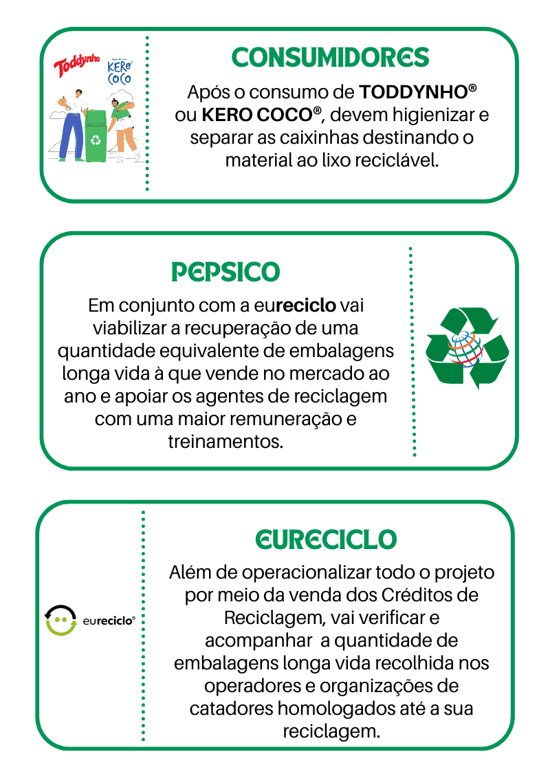 Com as marcas Toddynho e Kero Coco, a PepsiCo lidera um projeto para fortalecer a cadeia de reciclagem das embalagens longa vida (UHT). Em parceria com a Eureciclo, empresa especializada em impacto socioambiental, a iniciativa busca tornar a reciclagem desse material mais atrativa, profissionalizando o setor e aumentando a renda das cooperativas e catadores.