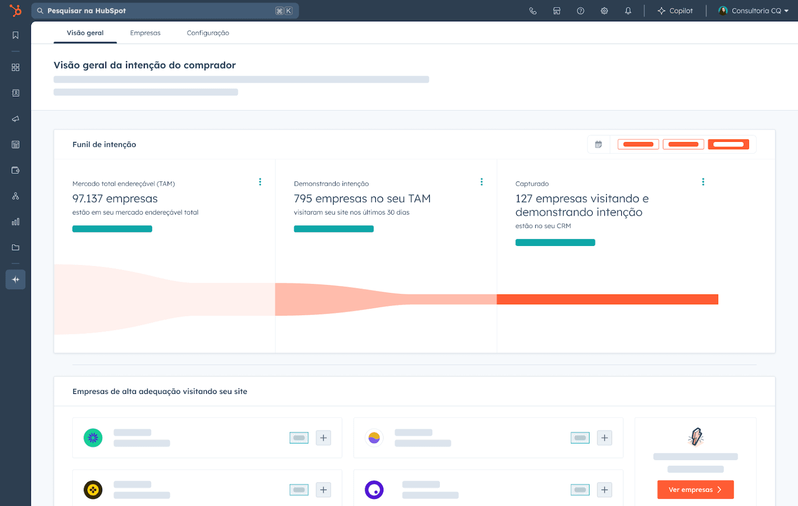 A área de Intenção do Comprador da HubSpot permite cruzar dados de ICP, como indústria-alvo, perfil de empresa, funcionários, entre outros, com atividade de visita à página da web e outros critérios de intenção.