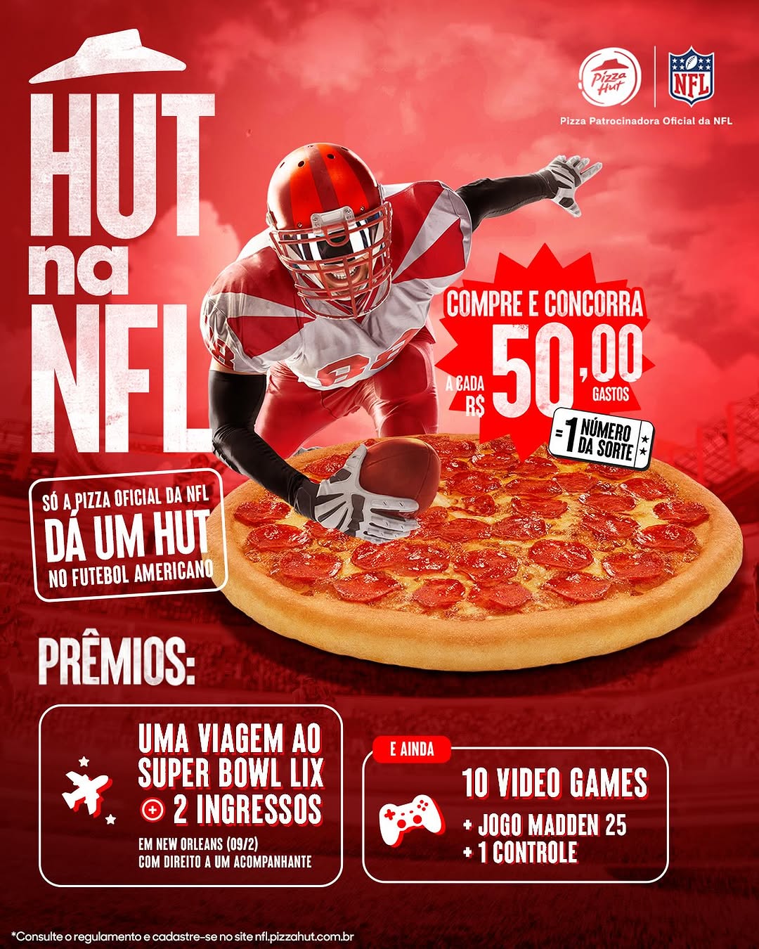 A Pizza Hut Brasil retorna como patrocinadora oficial da National Football League (NFL) em uma parceria que se estenderá até o final de 2025. Para celebrar o acordo, a marca desenvolveu a campanha "Hut na NFL", que inclui sorteios semanais de consoles PlayStation, copos colecionáveis da liga, e uma viagem com acompanhante para assistir ao Super Bowl LIX, no dia 9 de fevereiro.