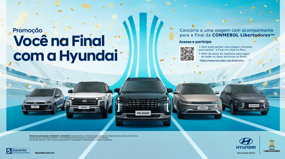 A Hyundai lançou a promoção “Você na Final com a Hyundai”, que levará três torcedores com acompanhante à final da CONMEBOL Libertadores 2025, em Lima. Além dos ingressos, os vencedores ganharão passagens, hospedagem e alimentação. A mecânica também oferece chances de ganhar pares de ingressos para jogos dos clubes brasileiros nas fases anteriores. A ação reforça a conexão emocional da marca com o futebol sul-americano.