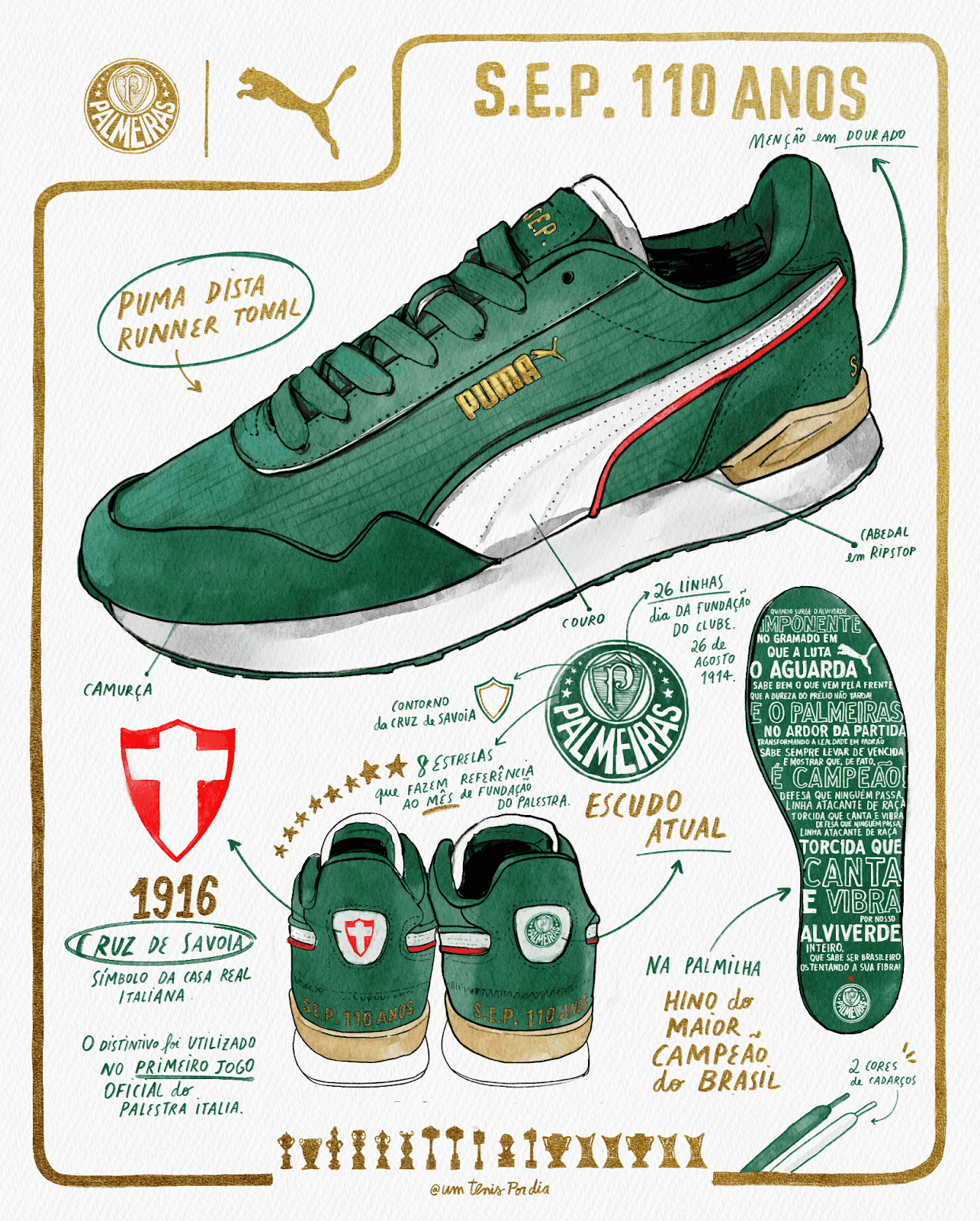 Outros detalhes importantes são as inscrições “S.E.P 110 ANOS”, no calcanhar, e a letra do hino do clube, gravada em ambas as palmilhas Para marcar o lançamento, a ilustradora Sarah Kamada, autora do perfil @umtenispordia no Instagram, foi convidada para criar uma arte especial e personalizada do modelo.