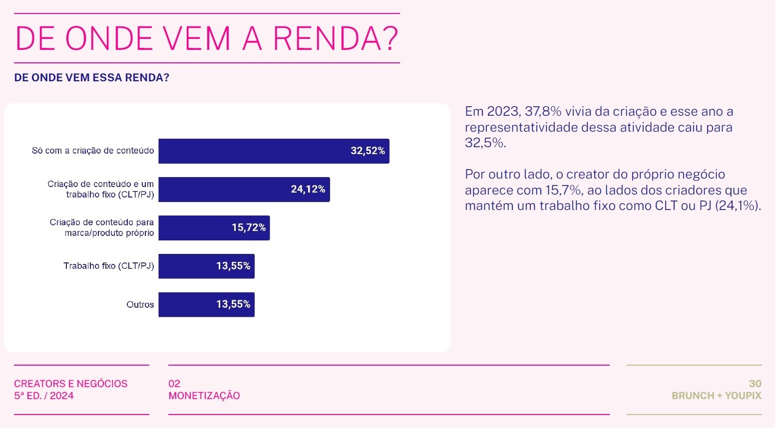 Outro dado importante da pesquisa é a origem dos ganhos dos influenciadores, que cada vez mais buscam complementar seu rendimento com outras atividades. Em 2024, apenas 32,52% dos criadores viviam exclusivamente da criação de conteúdo, representando uma queda em relação aos 37,8% de 2023. O restante dos influenciadores divide sua renda entre várias fontes: