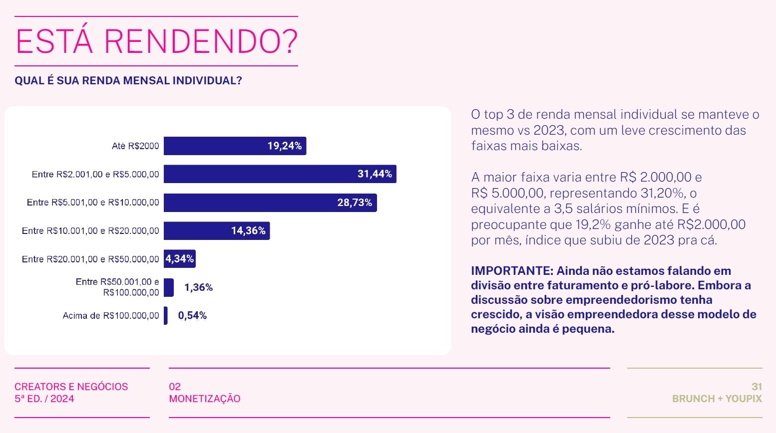 De acordo com o levantamento, a renda mensal dos influenciadores é distribuída da seguinte forma:19,24% ganham até R$ 2 mil, 31,44% ganham entre R$ 2.001,00 e R$ 5 mil, 28,73% recebem entre R$ 5.001,00 e R$ 10 mil, 14,36% ganham entre R$ 10.001,00 e R$ 20 mil. 4,34% faturam entre R$ 20.001,00 e R$ 50 mil, 1,36% ganham entre R$ 50.001,00 e R$ 100 mil e apenas 0,54% faturam acima de R$ 100 mil.