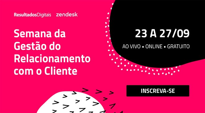 Entre os dias 23 e 27 de setembro acontece a Semana da Gestão do Relacionamento com o Cliente, organizada pela Resultados Digitais em parceria com a Zendesk. São 5 webinars ao vivo, sempre às 10h, com especialistas em encantamento de clientes, geração de indicação e fortalecimento de marca. A inscrição é gratuita e pode ser feita neste link.