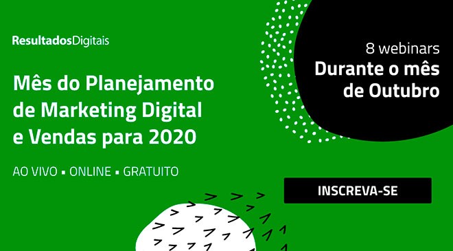 A RD lançou o Mês do Planejamento de Marketing e Vendas para 2020. A partir de 8 de outubro, serão 8 webinars ao vivo cobrindo todo o processo de elaboração de planejamento para 2020. Especialistas da Resultados Digitais conversarão ao vivo com profissionais de excelência de outras empresas. A inscrição é gratuita, e pode ser feita neste link.