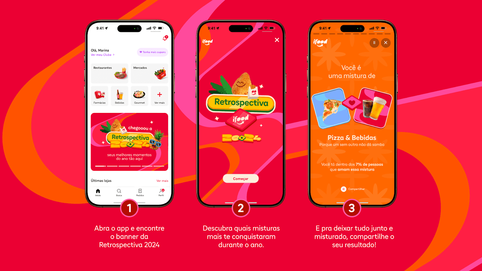 Com o tema "mistura perfeita", a retrospectiva oferece uma análise abrangente dos hábitos de consumo, destacando as comidas e itens mais pedidos no ano, as lojas favoritas, os horários de pico dos pedidos e o tempo economizado ao usar o iFood. A grande novidade deste ano é a inclusão de informações de todas as verticais do marketplace do iFood, abrangendo compras de mercado, farmácias, pet e shoppings.