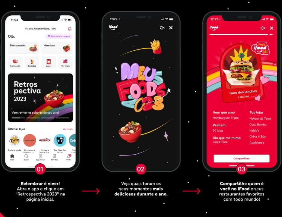 Em formato de story, o Meus Foods estará disponível aos mais de 43 milhões de consumidores da plataforma até o dia 8 de janeiro de 2024. Os dados mostram curiosidades divertidas e úteis que fazem o usuário entrar no clima de fim de ano como dados da categoria e itens mais pedidos, horários preferidos e TOP cinco estabelecimentos.