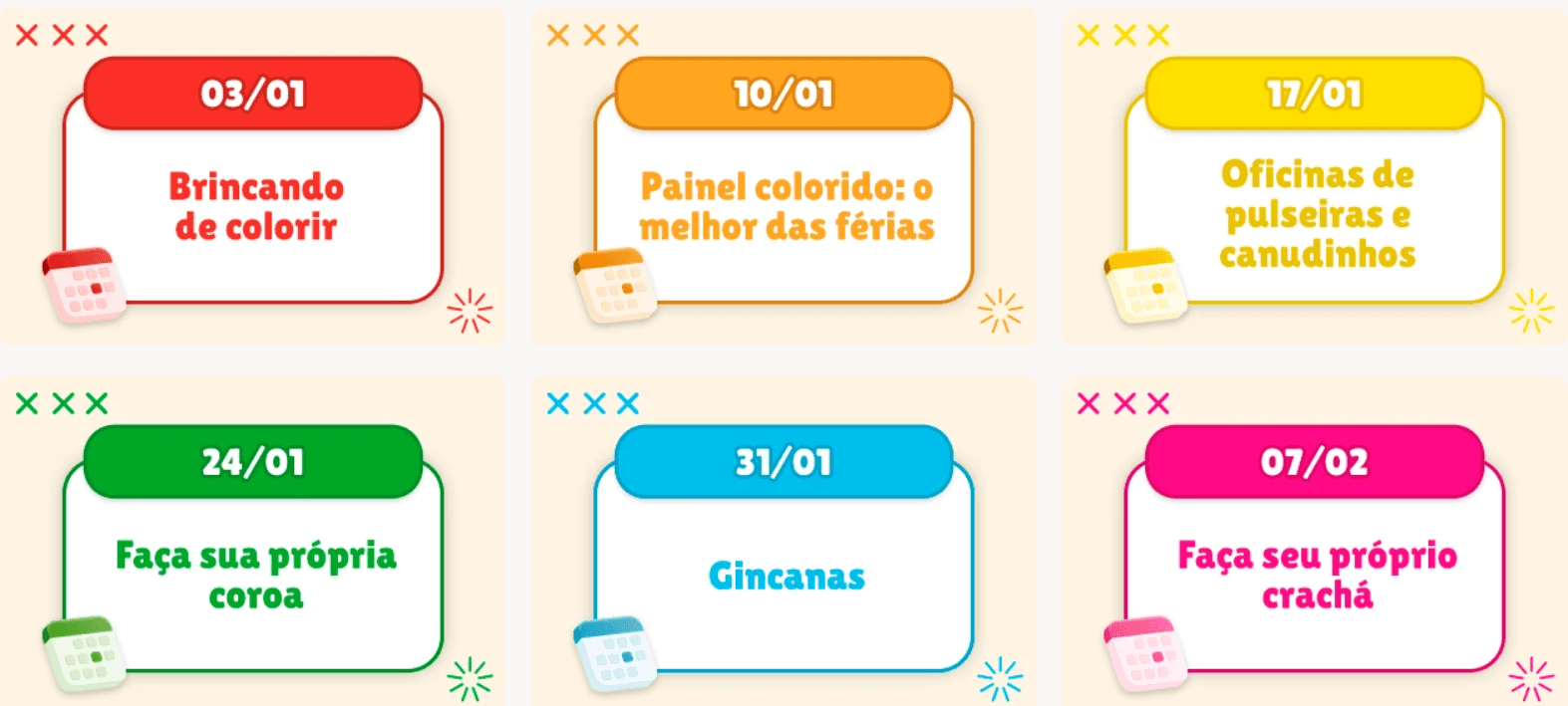 A proposta é transformar as unidades em pontos de encontro para as famílias durante o recesso escolar. Ao longo de todos os sábados de janeiro, a Ri Happy realiza o projeto “Happy Sábados”, com atividades distribuídas em estações temáticas representadas por cores, que incluem oficinas de pintura, trabalhos manuais, jogos clássicos e experimentação de brinquedos.