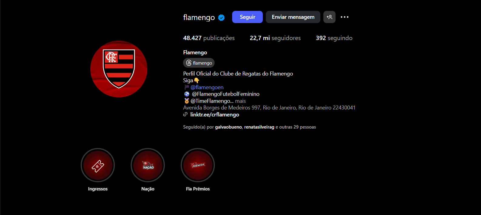 O Flamengo aparece em segundo lugar, com 385 mil novas adesões, impulsionadas pelo avanço às quartas de final da Libertadores. O Rubro-Negro liderou os ganhos no Instagram (220 mil) e no YouTube (50 mil), além de conquistar 100 mil novos seguidores no TikTok. Com isso, alcançou a marca inédita de 64 milhões de inscrições no conjunto de suas redes sociais.