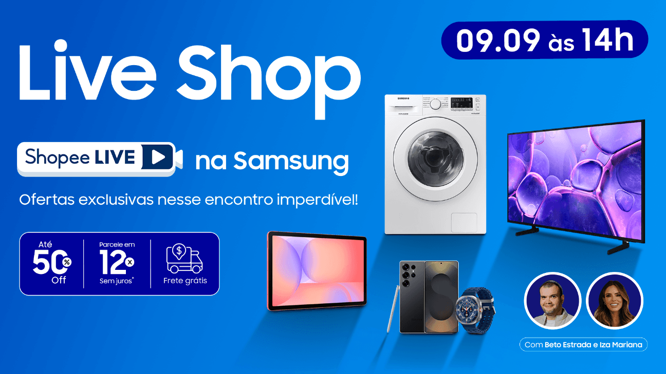 Agora, no 9.9 a Shopee também passa a levar sua força para outras marcas. No 9.9 Super Shopping Day, a Samsung realiza sua primeira Live Shop em parceria com a Shopee, transmitida direto da Casa Conectada da marca. O evento, exibido tanto na Shopee Live quanto no YouTube da Samsung, traz promoções em TVs, smartphones, smartwatches, fones de ouvido, notebooks e tablets.