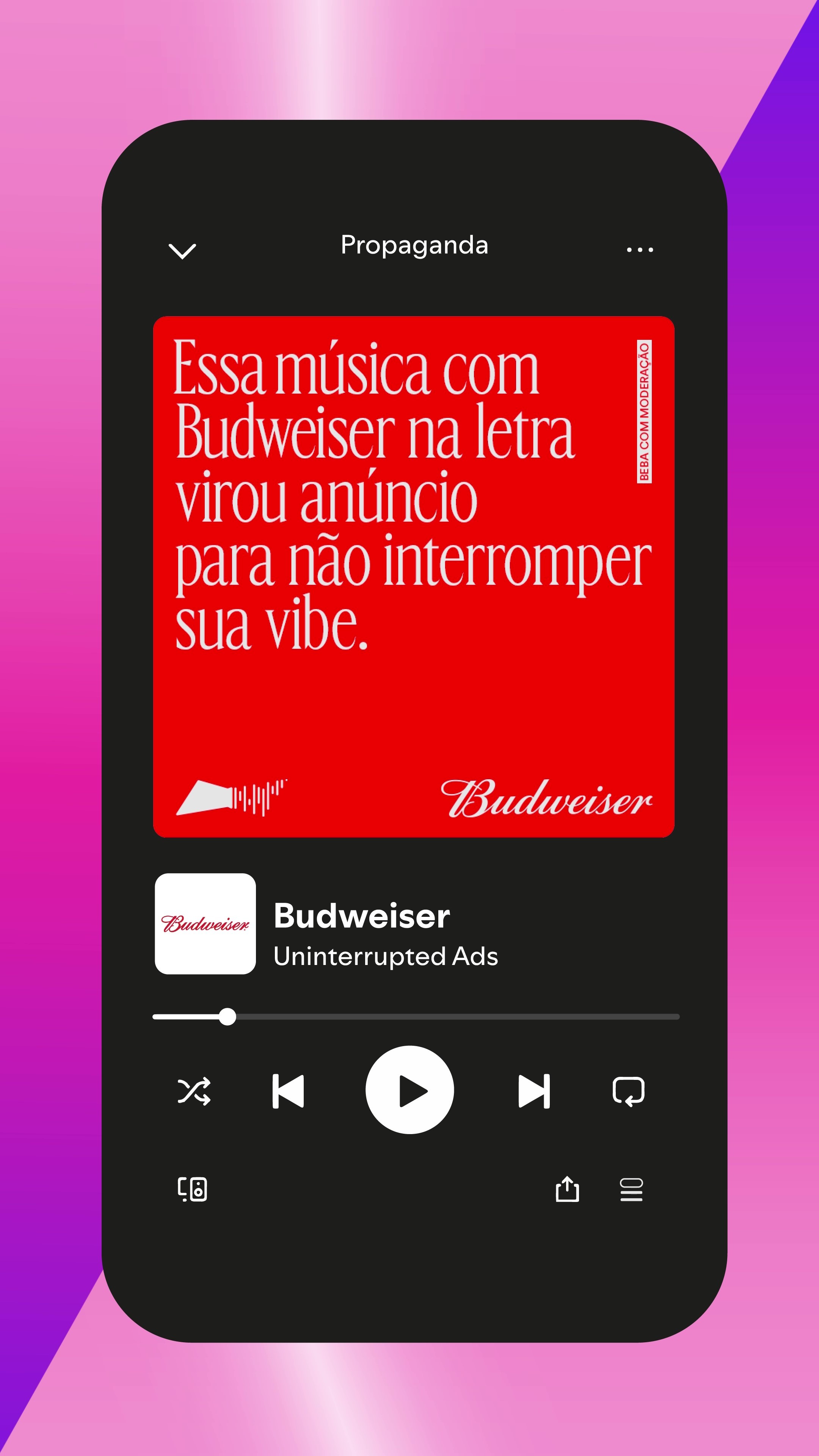 Para não interromper a experiência dos ouvintes, a Budweiser inovou junto a Africa Creative usando o formato Sponsored Sessions, que garante minutos de música sem anúncios após ouvir uma mensagem da marca. A campanha trouxe uma leitura direta e transparente sobre essa troca, ganhando o ouvinte pela honestidade e inteligência no uso do canal. O resultado: mais de 90% de completion rate e alta associação da Bud com momentos de relaxamento e música.