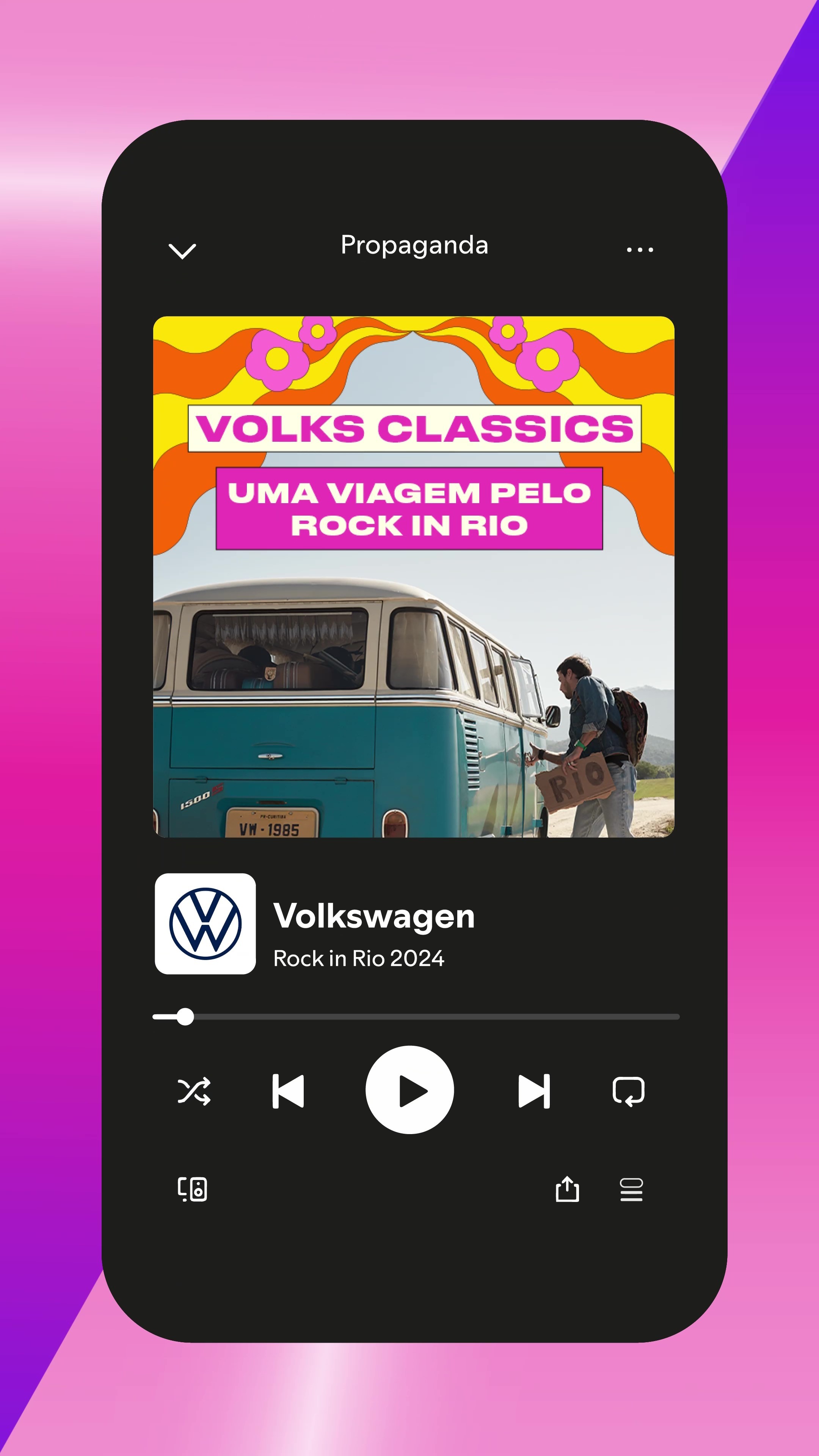 Junto a AlmapBBDO, a Volkswagen aproveitou todos os formatos possíveis do Spotify para amplificar sua presença no Rock in Rio. Desde playlists personalizadas até anúncios em áudio, vídeo e display, a campanha garantiu cobertura e frequência com sofisticação. A integração com o festival e com os gostos dos usuários fez com que a marca se tornasse parte da experiência musical.