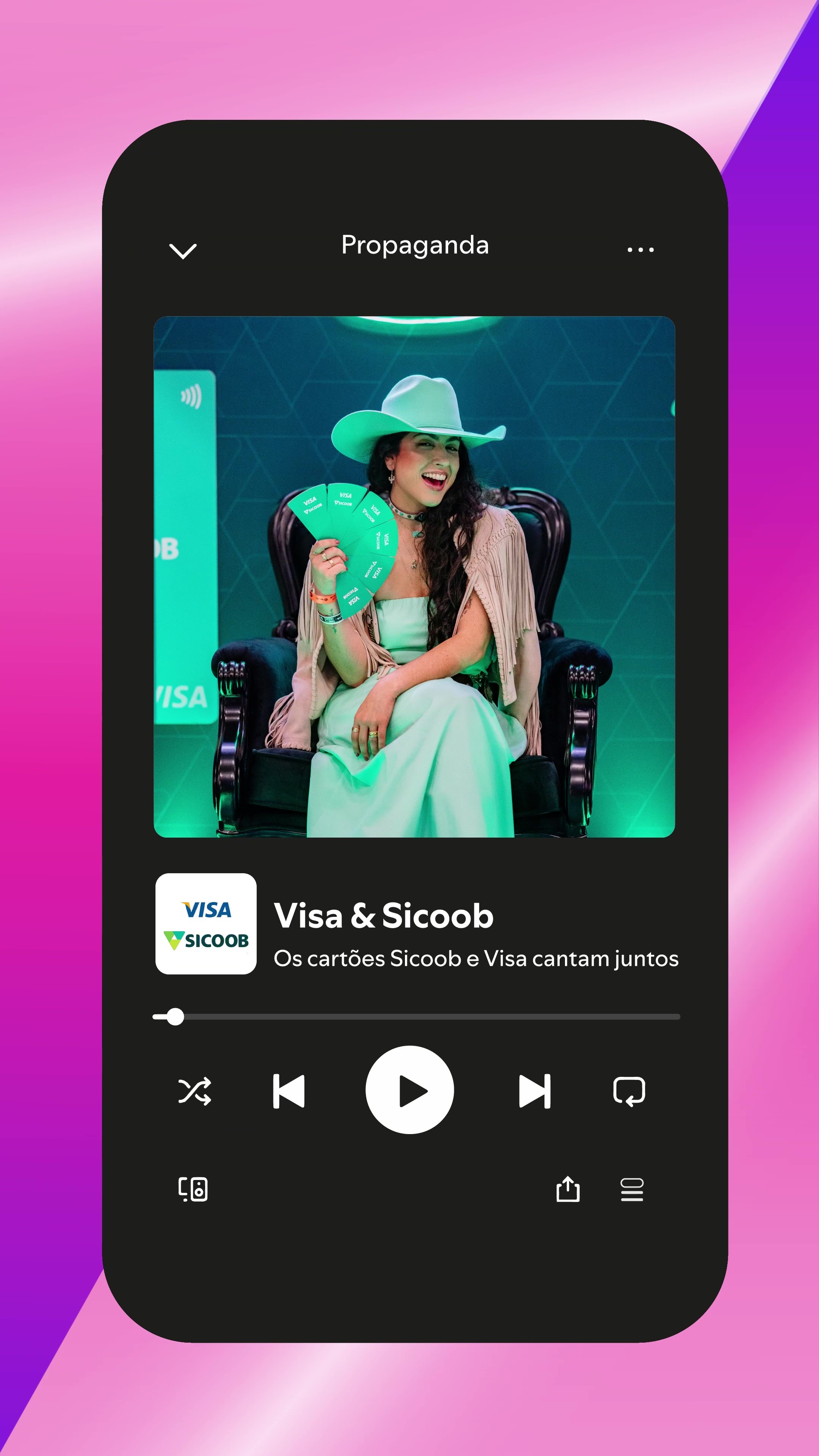 Para reforçar a parceria entre Sicoob e Visa, a campanha apostou em patrocínios inteligentes dentro do Spotify. Com conteúdos personalizados e formatos que exploravam os hábitos musicais dos ouvintes, a dupla de marcas ampliou presença e criou associação positiva com momentos de diversão, lazer e consumo. O resultado do trabalho da VTeam (VML e Fbiz) foi um aumento relevante de lembrança e intenção de uso.