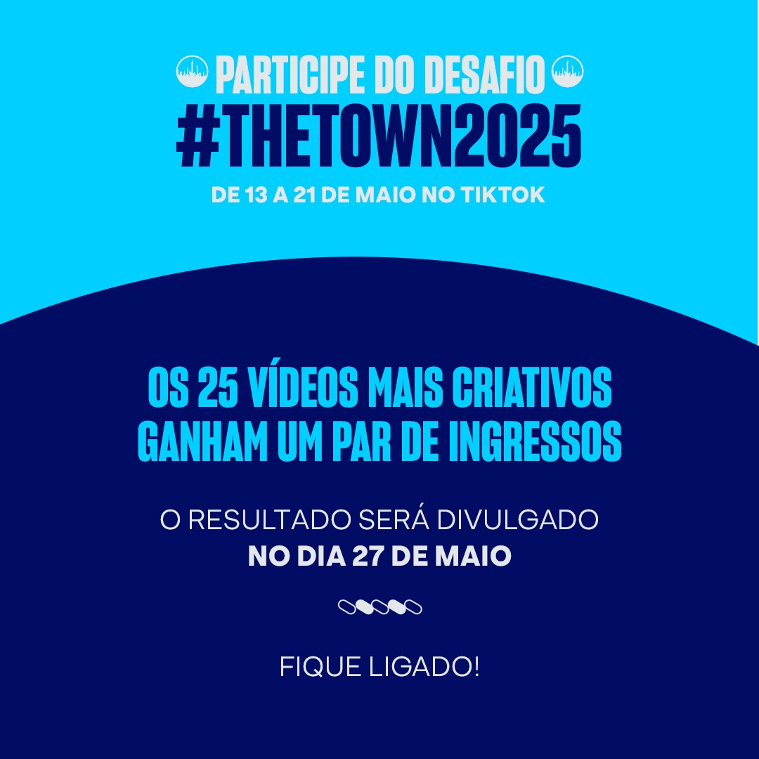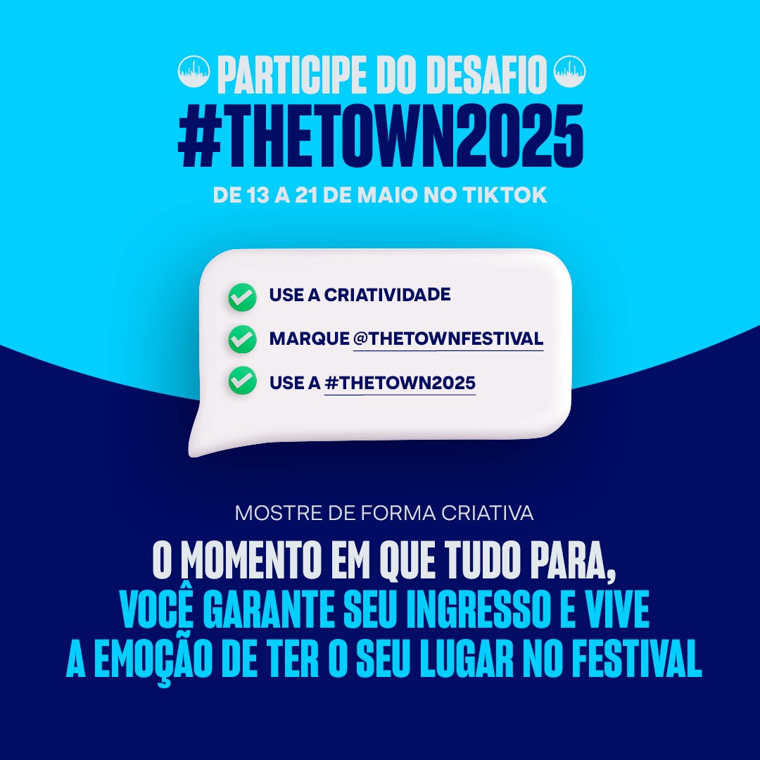Para participar, é necessário ter o perfil público, seguir o The Town na plataforma, usar a hashtag #TheTown2025 na legenda e garantir que o universo do festival esteja claramente representado no vídeo. O resultado será divulgado no dia 27 de maio nos canais oficiais do evento. Cada CPF poderá ser premiado uma única vez e conteúdos que não atenderem aos critérios estabelecidos serão desclassificados.